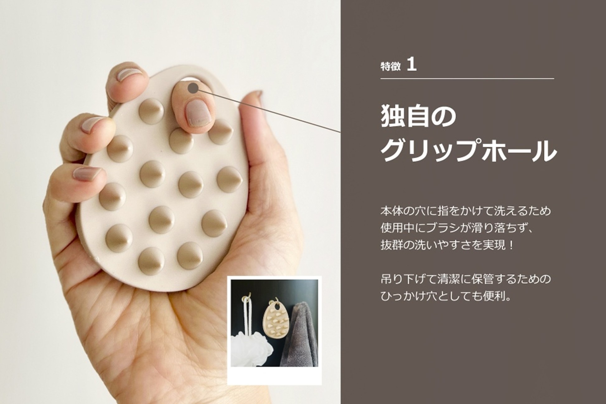 ・使用方法:髪と頭皮を十分にシャンプーで泡立てたら、ブラシを動かして頭皮を洗います。本体の穴(グリップホール)に人差指や中指をかけることで、滑らずに洗いやすくなります。