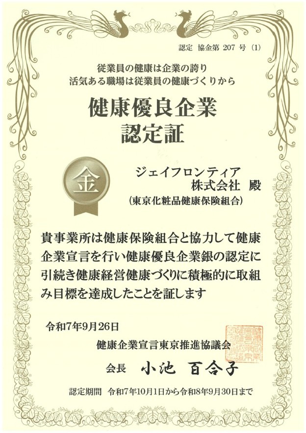 ジェイフロンティア株式会社(本社:東京都渋谷区、代表取締役社長執行役員:中村篤弘、以下「当社」)は、健康保険組合連合会東京連合会に「健康企業宣言」を行い、積極的な健康経営への取り組みを実施し、「健康優良企業(金の認定)」(認定 協金第207号(1))を2年連続で取得したことをお知らせいたします。
