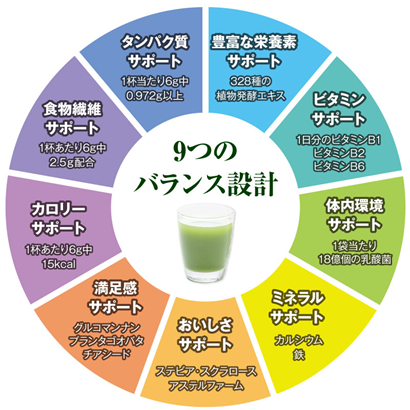 1杯9つの栄養バランス設計を実現し、ダイエット中でも、しっかりとした栄養補給を可能にします。